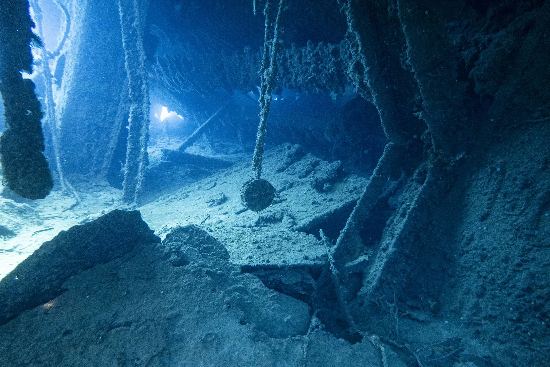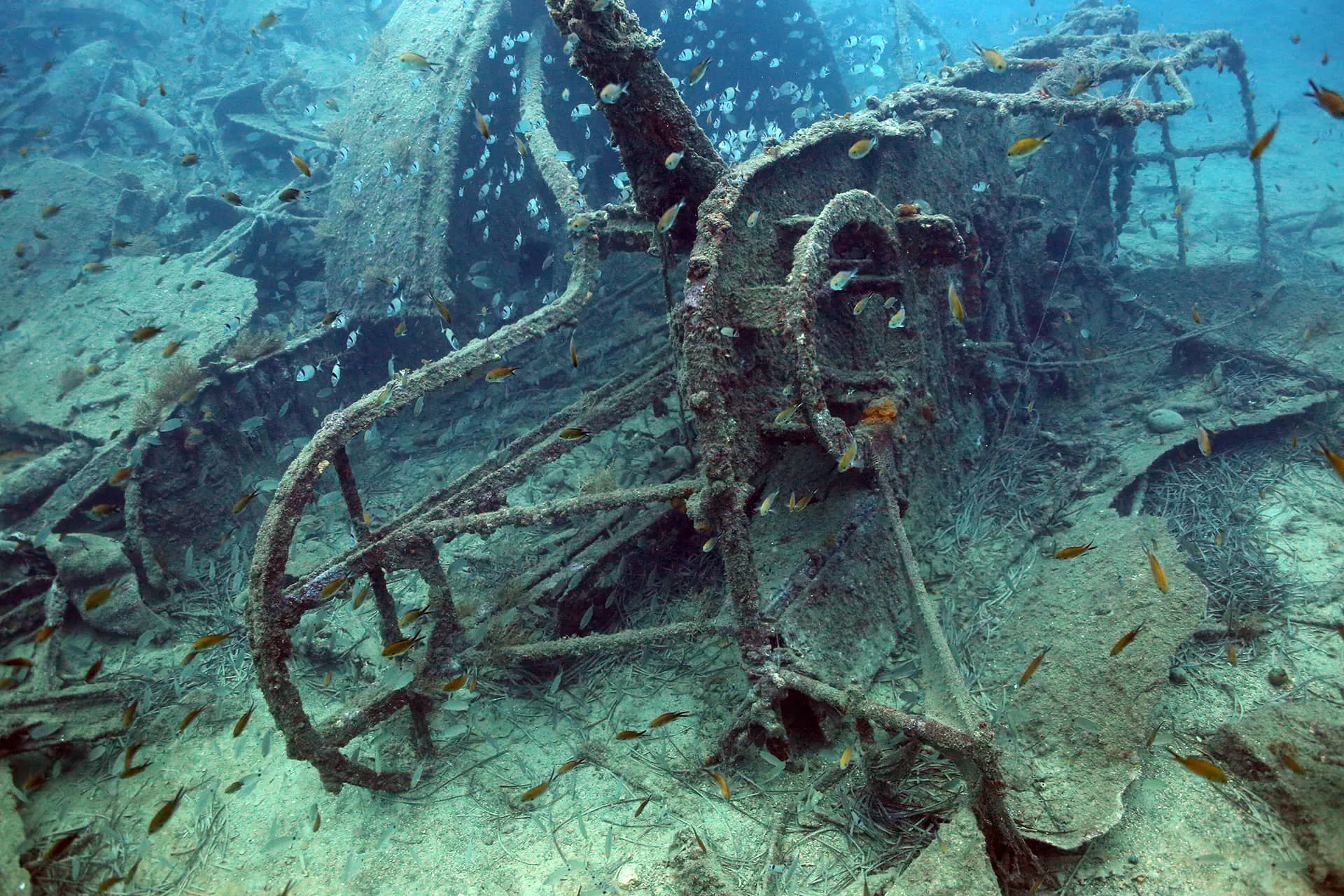 A large number of unexploded shells of various sizes on the wreck's surface.